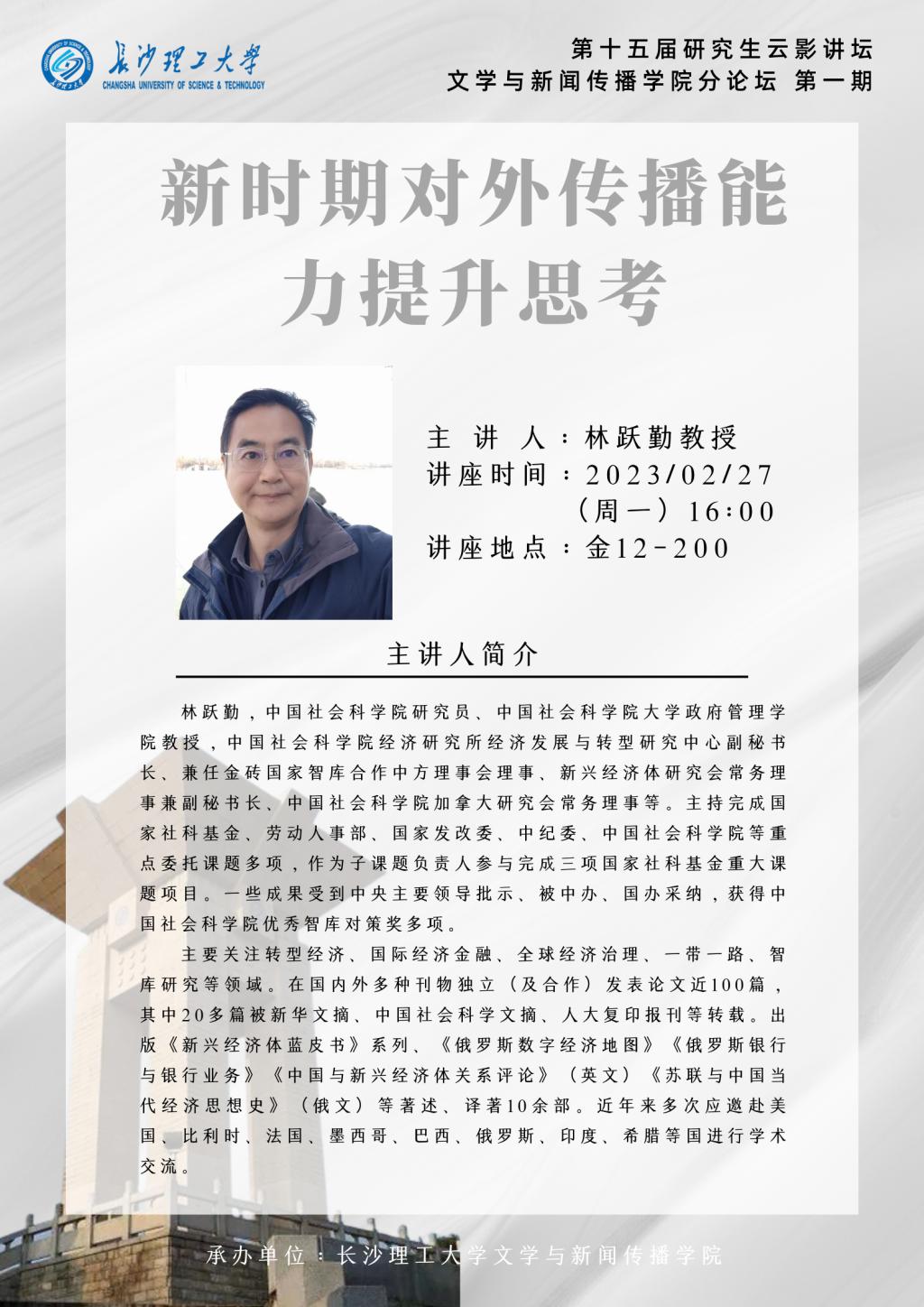 2023年2月27日下午,在太阳成集团tyc122cc入口金盆岭校区12号教学楼内,第十五届研究生云影讲坛文新学院分论坛第一期如约进行。本次讲座邀请中国社会科学院研究院林跃勤教授为学生们讲授主题为“新时期对外传播能力提升思考”的讲座。