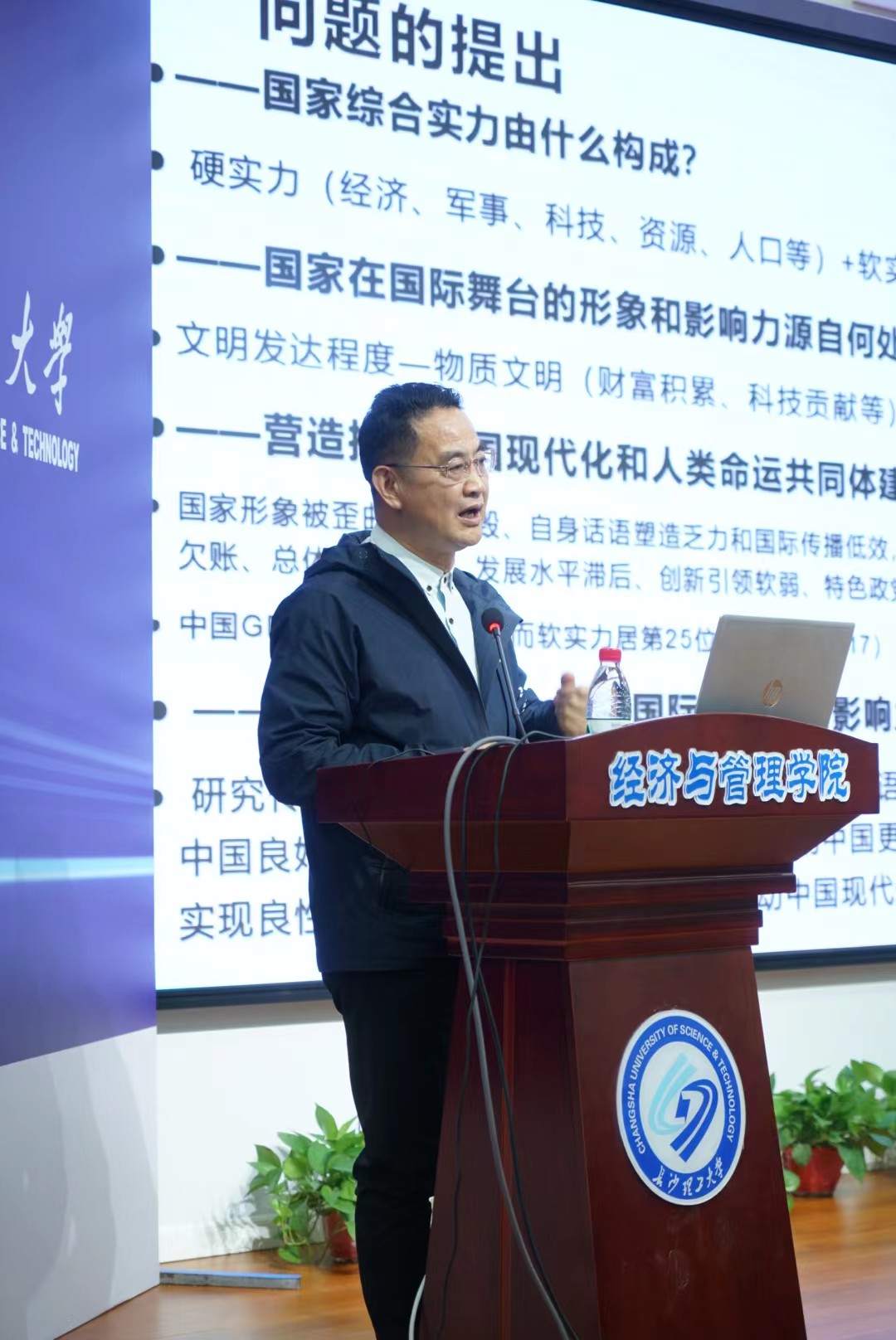 讲座伊始,林跃勤教授通过对当前国际形势的分析,引出“国家综合实力由什么构成?国家在国际舞台的形象和影响力源于何处?改善国际形象、提升国际话语权和影响力有何意义?”等四个问题。重点围绕国际传播能力展开论述。并将国际传播能力基本构成分为机制政策保障、媒体机构实力、传播影响力三个部分。