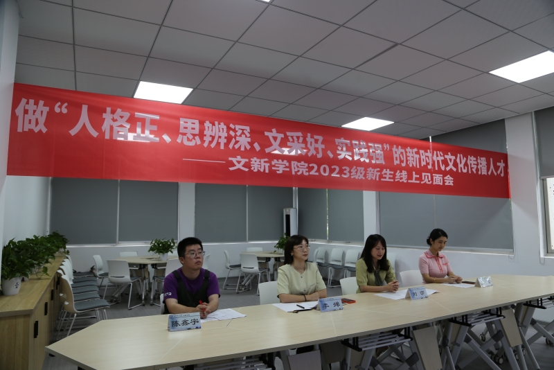 9月14日下午2点,文新学院在金盆岭校区9教223团体辅导室举行2023级新生线上见面会,院党委副书记刘莎出席,学工办全体辅导员及2023级全体新生参加。