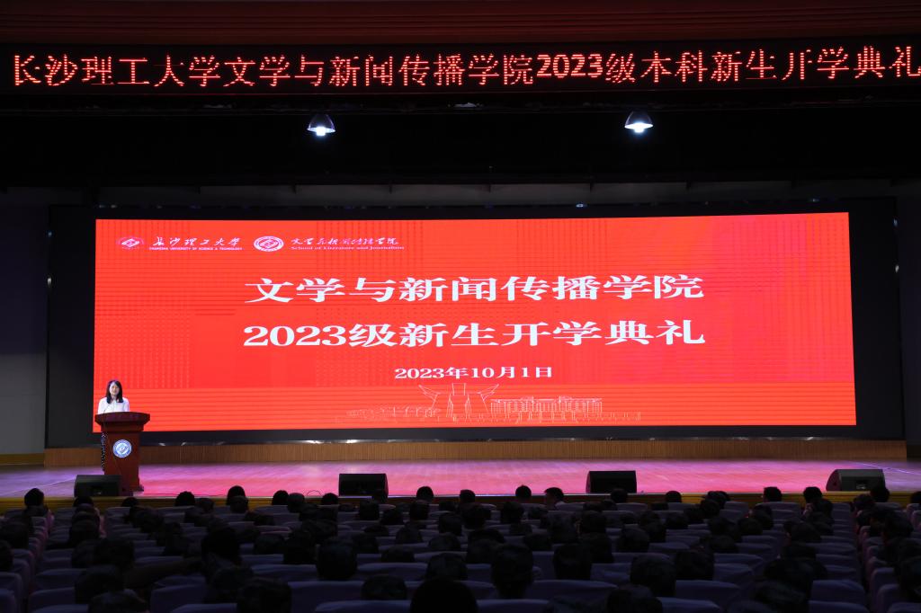 2023年10月1日上午,太阳成集团tyc122cc入口文学与新闻传播学院在金盆岭校区5教报告厅举行2023级本科新生开学典礼,院长刘建新、院党委副书记(主持工作)陈仁凯、副院长周云鹏、戴钰、院党委委员郑劭荣、优秀校友曾高飞、蔺晨阳、系部主任、支书、行政办公室主任、新生班主任及辅导员出席,全体2023级新生参加。典礼由院党委副书记刘莎主持。