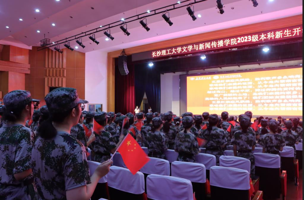 优秀学生代表姚子娴以自己的大学生活为例,用心态转变、评价标准、挑战探索这三道大门为新生们分享自己大学生活的所思所感,鼓励新生们不断挖掘自我,找到独属于自己的最佳生活节奏,度过充实的大学四年。2023级新生代表刘镔方以“长青云之志,理鹏鸟之思”为题,用校训“博学、力行、守正、拓新”表达了勤奋学习、艰苦奋斗的决心。随后,2023级新生全体起立,将右手举过头顶,跟随领誓人进行宣誓,立志成为一名人格正、思辨深、文采好、实践强的新时代文化与传播人才。