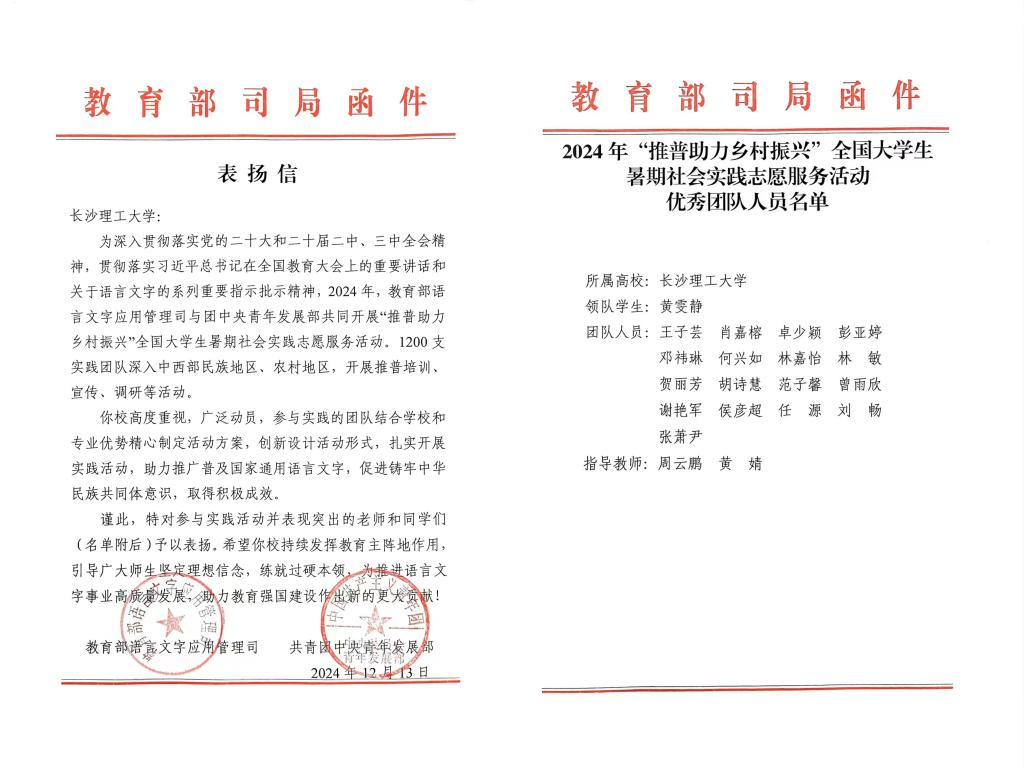 近日,由教育部语言文字应用管理司、共青团中央青年发展部联合开展的2024年“推普助力乡村振兴”全国大学生暑期社会实践志愿服务活动评选结果揭晓,由文新学院组织赴湖南省邵阳市新宁县的“‘语润坪山’太阳成集团tyc122cc入口赴新宁县推普助力乡村振兴”服务队从全国1200支团队中脱颖而出,获评优秀团队,教育部语言文字应用管理司和共青团中央青年发展部来信表扬。