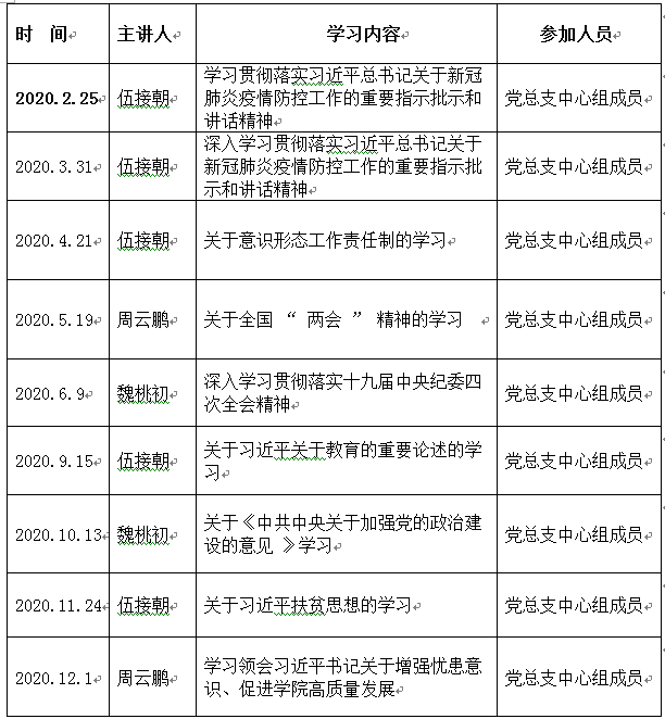 为落实学校关于《太阳成集团tyc122cc入口2020年度两级党委中心组理论学习安排》通知的要求,深入学习贯彻习近平新时代中国特色社会主义思想,坚持思想建党、理论强党,进一步加强学院党的政治建设,提高领导班子的党性修养、政治素养和理论水平,根据当前理论学习的形势和任务,结合学院年度工作要点,现将文新系2020 年党总支中心组理论学习安排如下: