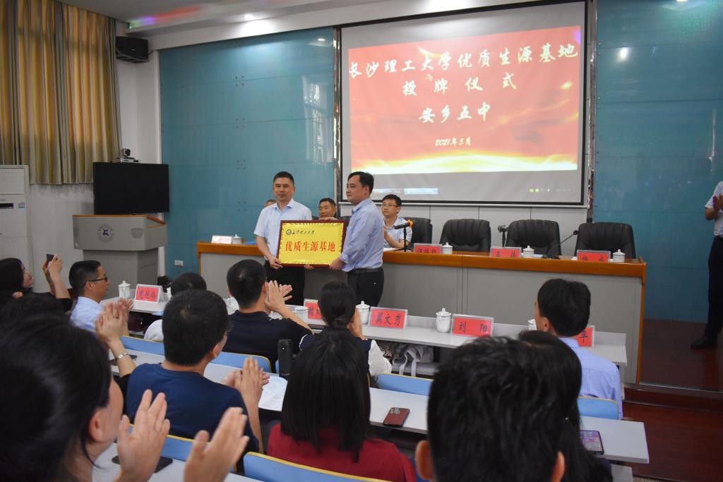 5月13日,长沙理工大学一行走进常德市安乡县,授予安乡一中和安乡五中“优质生源基地”的光荣称号,与安乡县副县长张益源和两所中学校长等就生源基地建设、拔尖创新人才培养、高中大学教育衔接等进行深入交流。文新学院党总支书记伍接朝、法学院党总支书记田兴洪、交通学院副院长吴伟等10人参加走访。