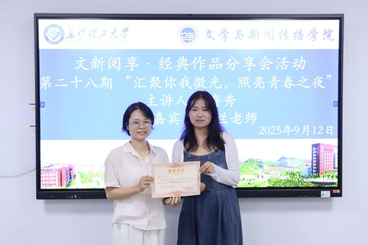 活动最后,刘海兰老师为马存秀颁发“优秀主讲人”证书并合影留念。本次分享会为同学们提供了交流文学感悟的平台,有助于深化对文学作品的理解,启发大家从阅读中观照现实,思考人生。