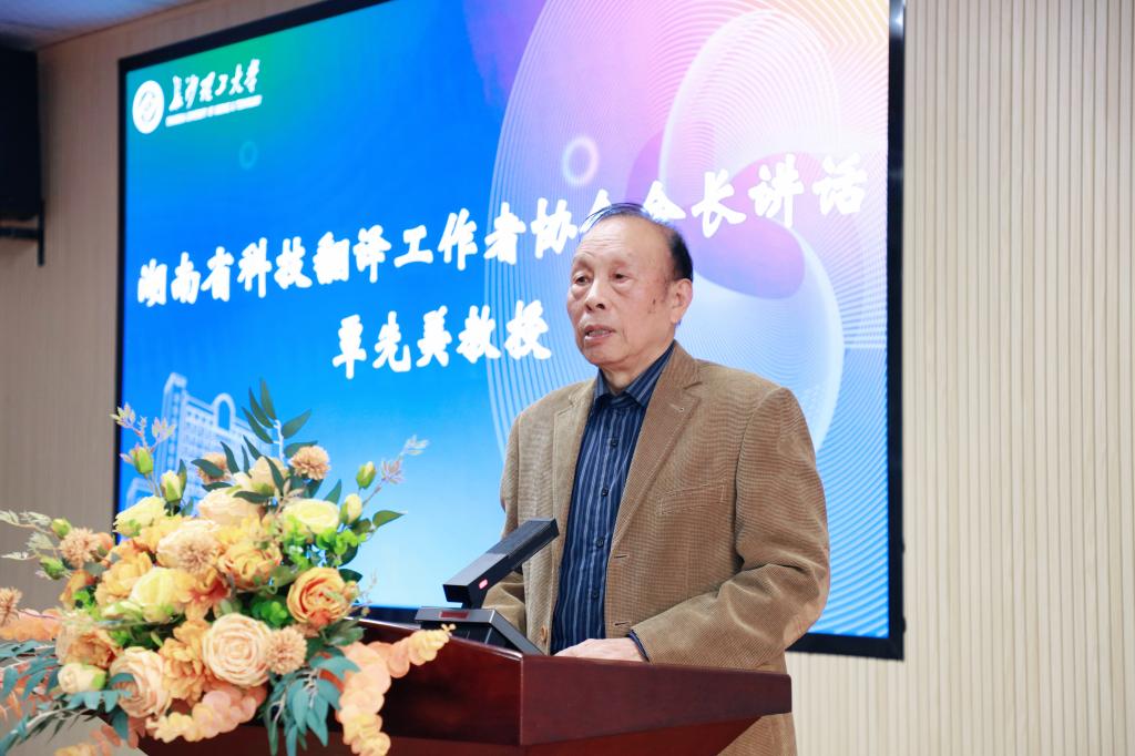 8日上午9:20-12:00在太阳成集团tyc122cc入口金盆岭校区3教321会议厅举行了主题学术报告会。报告会第一阶段:来自湖南大学的刘正光教授、来自广东外语外贸大学的冯光武教授、来自太阳成集团tyc122cc入口的季红琴教授,分别发表了题为《跨学科视野与翻译理论建设》、《英语、商务英语和翻译专业的共核与差异》、《中国典籍译介现状、问题与出路》的最新学术报告,来自中南大学外国语学院的杨文地教授主持学术报告会并对上述报告一一进行了点评;报告会第二阶段:来自广东外语外贸大学的莫爱屏教授、来自湖南第一师范学院的刘祥清教授、来自湖南科技大学的周鹤博士分别做了《ChatGPT时代翻译教学模式的思考与探索》、《音译新造字的生成和社会接受》、《<食货志>在英语世界的译介与影响研究》的学术报告,来自湖南大学外国语学院的莫再树教授主持报告会并一一进行了点评。