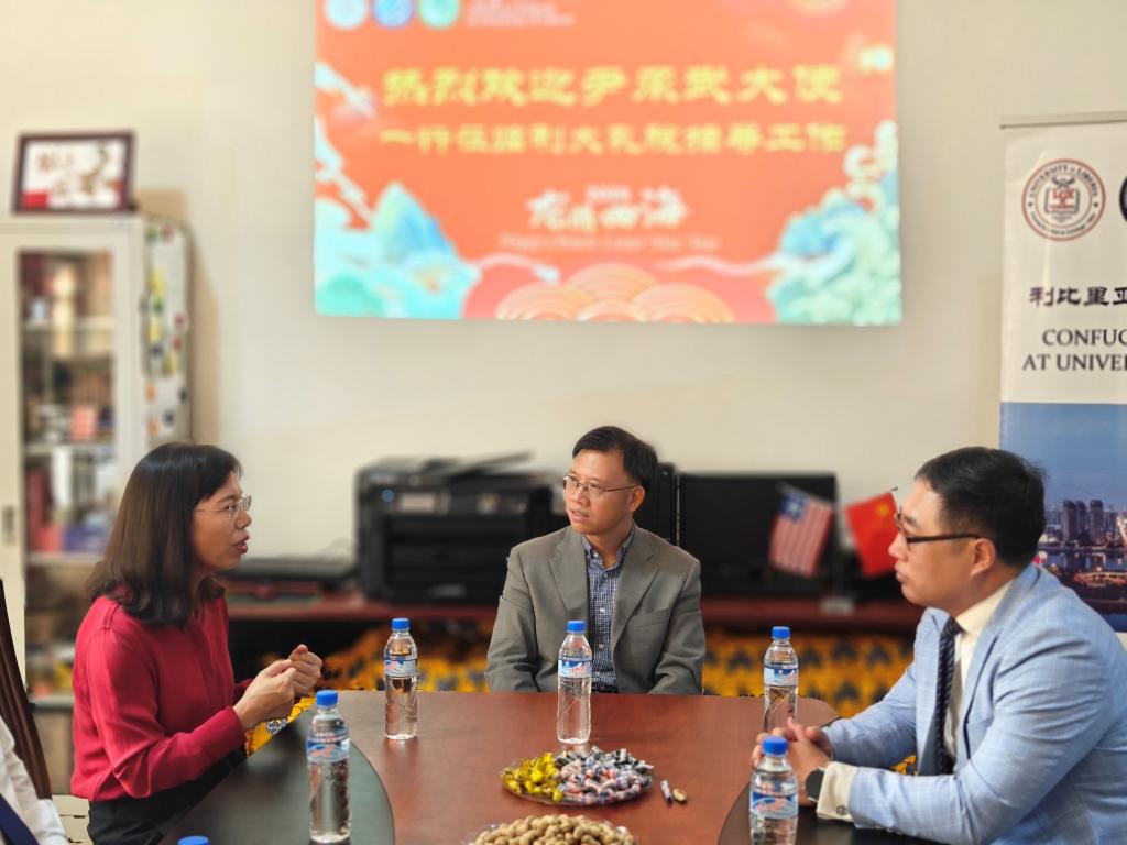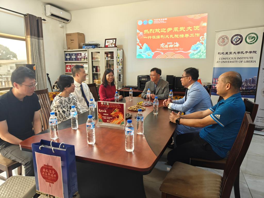 2024年2月8日,在龙年春节即将来临之际,中国驻利比里亚使馆大使尹承武先生,商务参赞王嘉欣先生以及秘书苟飞先生一行人等满载新春贺礼,专程来到利比里亚大学孔子学院进行慰问。他们的到来为孔子学院带来了浓浓的暖意。