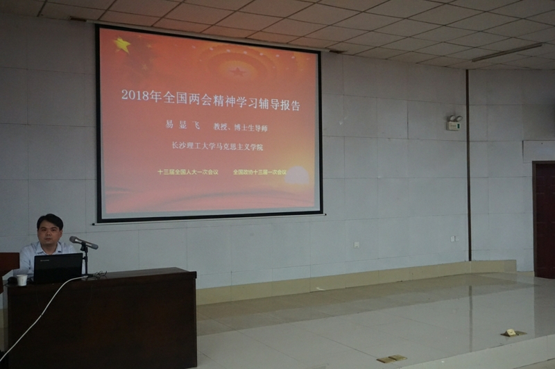 易显飞从两会盛况、两会成果、政府工作报告解读以及如何将两会精神落实到学校具体工作四个方面作了详实生动的报告。他指出,两会主题鲜明、议程丰富、意义重大、会纪严明、风清气正、安排紧凑,代表履职认真、议政深入、成果丰硕。他用详实的数据和雄辩的国际比较生动地解读了政府工作报告,突出了国家建设取得的非凡历史成就,彰显了以人民为中心的发展理念,体现了习近平新时代中国特色社会主义思想的光辉。他倡导学院应结合校情院情学习贯彻两会精神,倡导教师领悟“全员育人”、“立德树人”的深刻内涵,将个人“职业梦”、学院“发展梦”、学校“百强梦”和祖国的“中国梦”统一起来,为学校建设“双一流”和创建“百强大学”贡献力量。