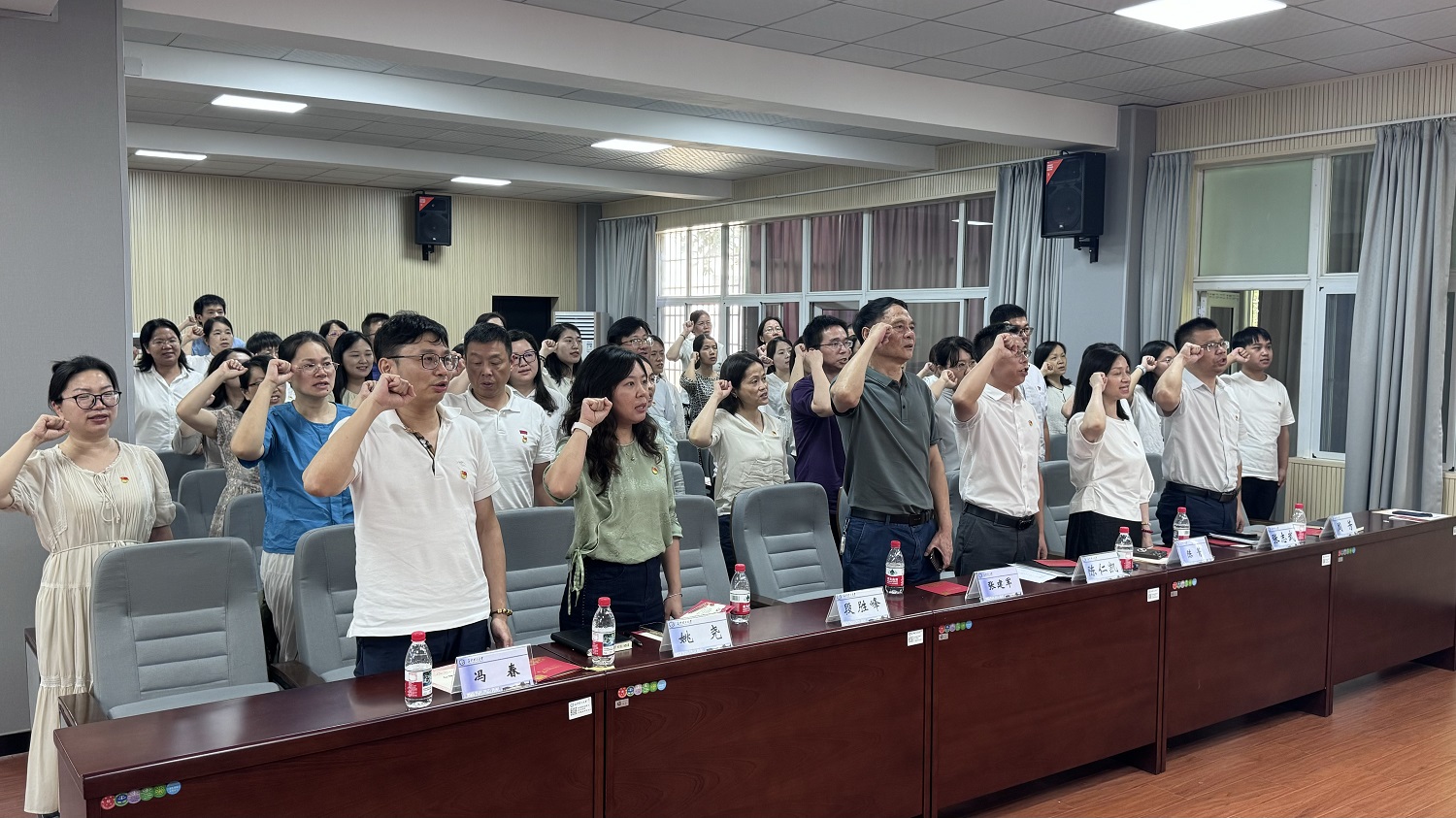 学院党委副书记周芳带领新党员宣誓,全体师生党员共同重温入党誓词。