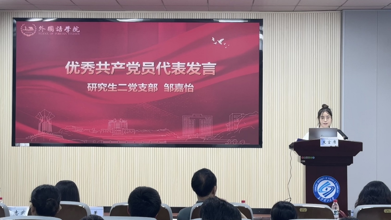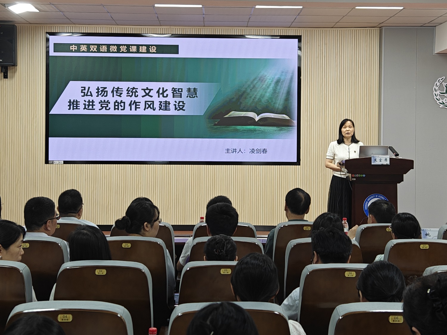 在表彰大会之前,优秀微党课一等奖获得者凌剑春同志为全体党员上了一堂题为“弘扬传统文化智慧  推进党的作风建设”的微党课,这是公共外语一教研室党支部中英双语微党课建设的成果之一。全体党员跟随凌老师的讲授,从中华优秀传统文化中汲取作风建设的养分,以中西文化互鉴的方式进行了党课学习,以外语人的方式庆祝党的生日。