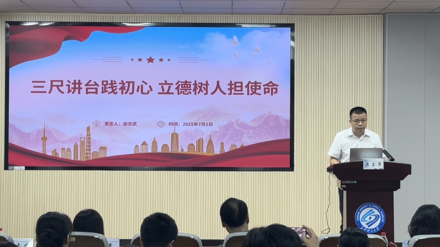优秀教师党员代表张志武分享了教学、科研、育人等方面的奋斗历程和感悟。他坚守教育初心,关爱学生成长,用自己多年来踏踏实实、兢兢业业、不忘初心的工作,诠释了什么是教师党员的责任与担当,什么是教育事业的初心与使命。