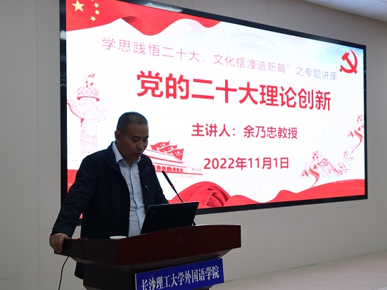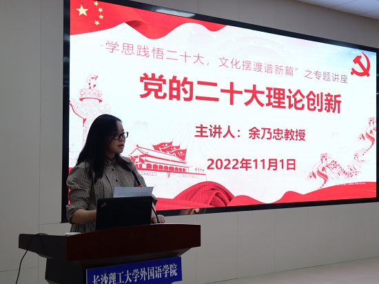 11月1日下午在云塘校区文科楼A-100学术报告厅,外国语学院邀请马克思主义学院余乃忠教授作“学思践悟党的二十大,文化摆渡谱新篇”之专题讲座。学院党委书记文丽丽主持,全院教职工120余人参会。