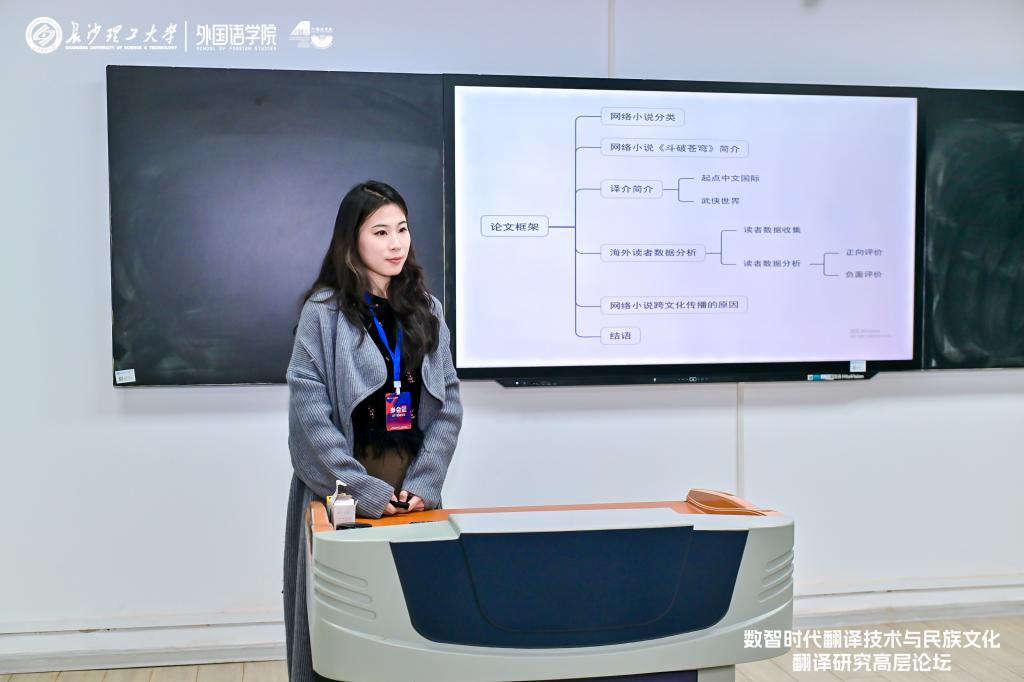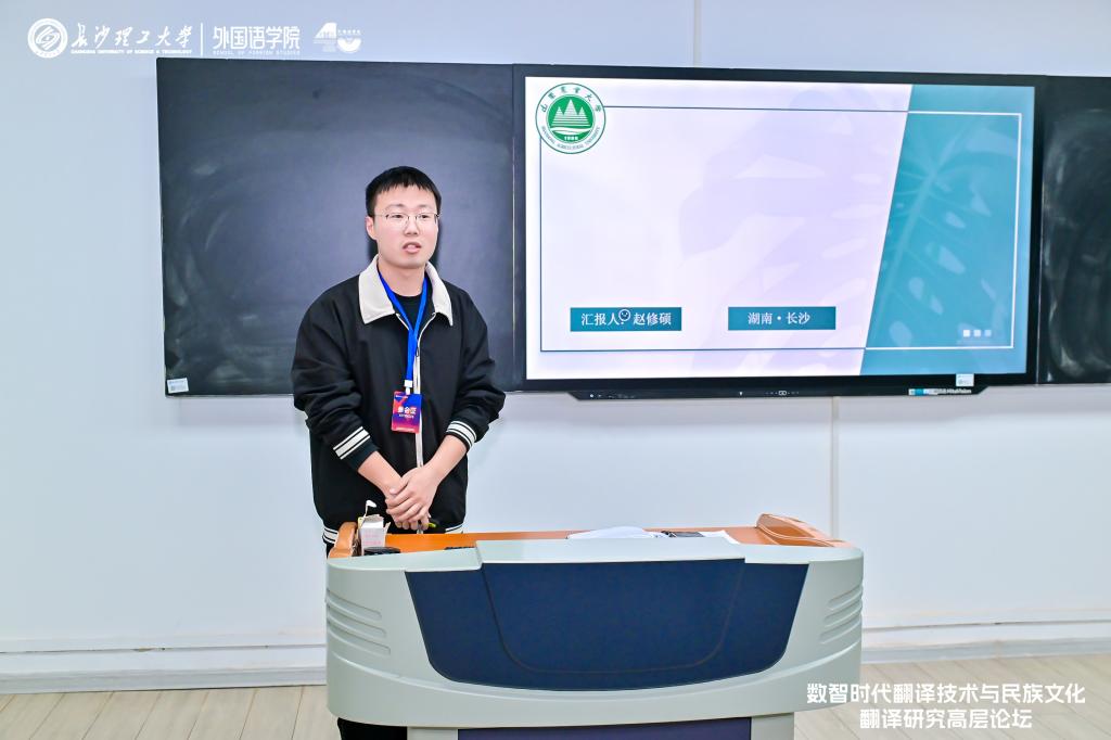 湖南科技大学禹玲教授在分论坛上宣讲了题为湖南大公报特征文学翻译研究学术研究,通过对民国时期湖南《大公报》的翻译文学特征进行分析,探讨了湖南本土报纸中外国文学汉译的特点及其影响。太阳成集团tyc122cc入口的刘思利从传播学5W视角出发,研究了湖湘花鼓戏外宣翻译策略与传播途径,为推动中国传统文化走出去提供了新的视角。同样来自太阳成集团tyc122cc入口的陈慧则聚焦湘西地区珍贵的非物质文化遗产,以纽马克翻译理论为指引,为非遗的国际传播开辟新路径。此外,北京外国语大学的胡昕以人工智能译文为切入点,对湘赣花炮文化的接受度展开全面分析,为花炮文化的传承与传播提供新视角。