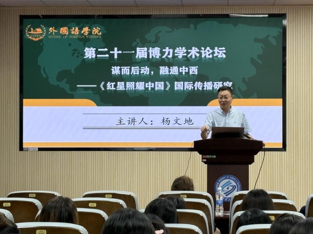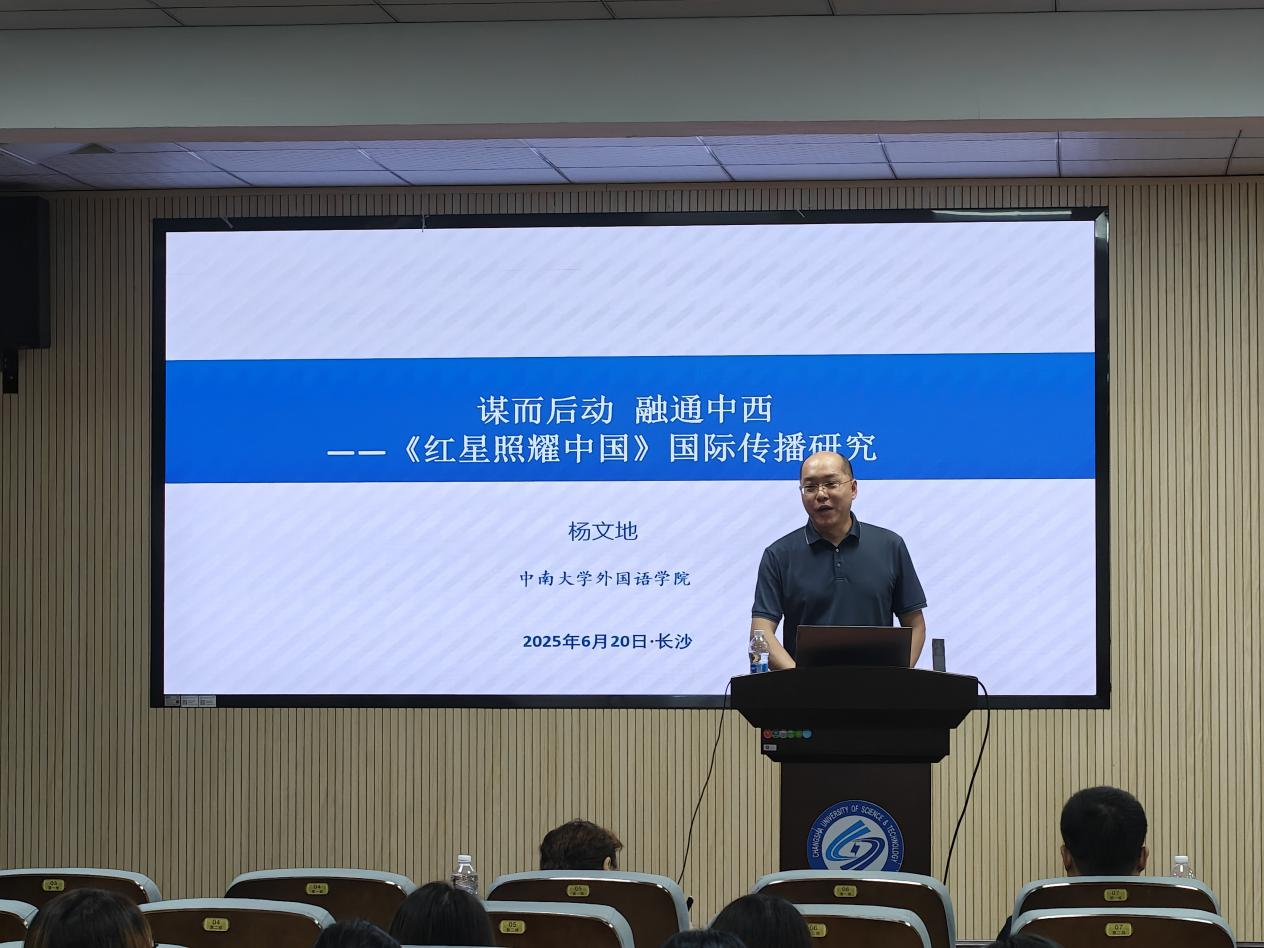 6月20日上午9点,太阳成集团tyc122cc入口第二十一届研究生博力学术论坛外国语学院专题论坛学术讲座在金盆岭校区三教321报告厅顺利举行。本次讲座主题为谋而后动,融通中西——《红星照耀中国》国际传播研究,由中南大学外国语学院院长、博士生导师杨文地教授主讲,外国语学院副院长姚尧担任主持人,众多师生参会。