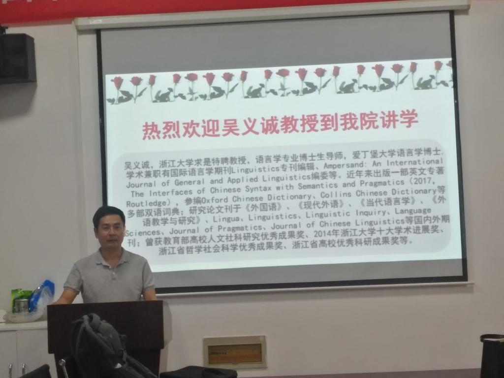 6月30日晚7点半,应外国语学院邀请,浙江大学求是特聘教授、博导吴义诚教授来我院讲学。讲座由外国语学院副院长黄月华主持,学院教师、学术型研究生参加了此次讲座。