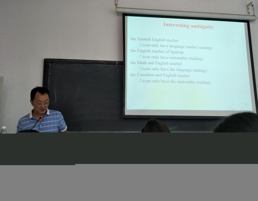 韩景泉教授是语言学博导、云山杰出学者,研究方向为理论语言学、生成句法学、语义学。在此次讲座中,他以英语修饰语在句子中的排列及引发的歧义为例,深入浅出地讲解了三层次句法分析法的运用。他的讲座生动有趣,激发了大家运用语言学理论探究语言现象的兴趣。莫爱屏教授为国家级同声传译实验教学中心主任,广东外语外贸大学外国语言学及应用语言学、翻译学研究中心研究员,博导。他基于对100篇翻译实践报告的调查,主要从翻译实践报告的构成、写作技巧及学术规范等方面详细讲解了翻译实践报告写作中的注意事项,为大家进行翻译实践及写作翻译实践报告指明了方向。