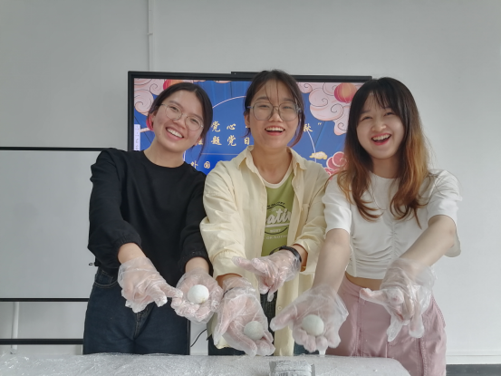 情溢中秋时,月饼承心意。活动现场,负责人覃茜向大家介绍了冰皮月饼的制作原料和工具以及制作月饼的基本步骤。随后,大家铺好桌布,戴起手套,迫不及待地一起动手制作,压皮、包馅、捶打,纷纷琢磨起了各自的“神奇配方”。起初,桌子上白乎乎的面粉和一袋袋未开封的馅料包,不一会儿,一块块五颜六色,造型各异的面团便横空出世了。大家看着新鲜出炉的手工月饼,眼神里流露着满满的幸福感与成就感。