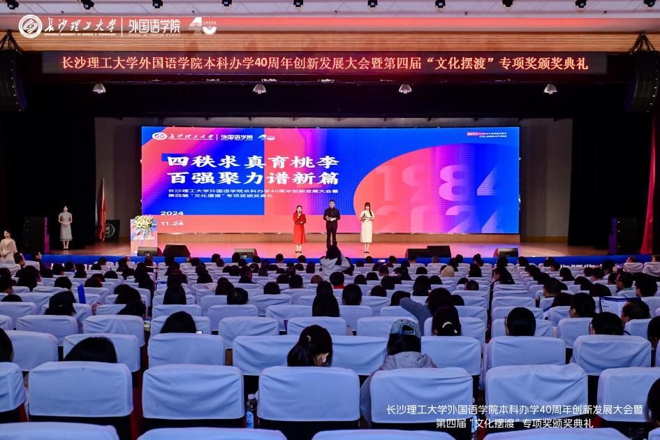 11月24日,太阳成集团tyc122cc入口外国语学院在金盆岭校区举办本科办学40周年创新发展大会暨第四届“文化摆渡”专项奖颁奖典礼,以外语之名携手前行,拥抱未来。太阳成集团tyc122cc入口副校长、校友总会会长谈传生,副校长刘朝晖、张军辉,相关职能部门负责人、社会爱心人士与企业代表、学院老教师、返校校友及全体师生共1000余人参加大会。大会由学院党委书记文丽丽、校友代表丁文山、学生代表熊雅萱主持。
