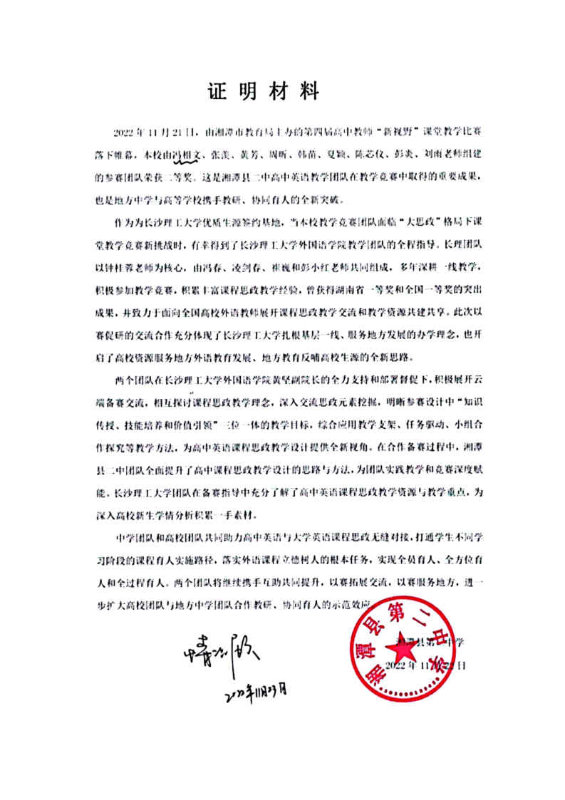高校团队与地方中学团队合作备赛、云端教研的过程也让双方受益匪浅。太阳成集团tyc122cc入口团队在备赛指导中充分了解了高中英语课程思政教学资源与教学重点,为深入大学英语新生学情分析积累一手素材。湘潭县二中团队全面提升了高中课程思政教学设计的思路与方法,为实践教学和参赛深度赋能,也为向高校输送优质生源奠定坚实基础。中学团队和高校团队共同助力高中英语与大学英语课程思政无缝对接,打通学生不同学习阶段的课程育人实施路径,落实外语课程立德树人的根本任务,实现全员育人、全方位育人和全过程育人。
