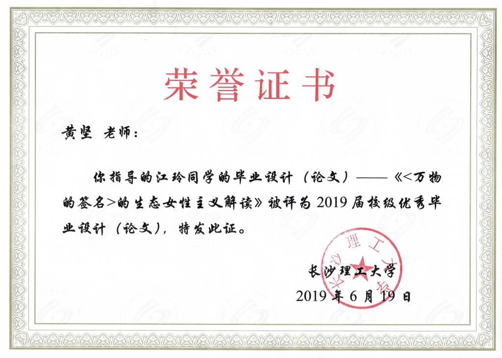 我院黄坚、季红琴两位老师指导的本科毕业论文被评为2019届校级优秀毕业论文: