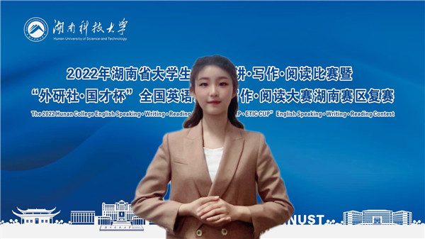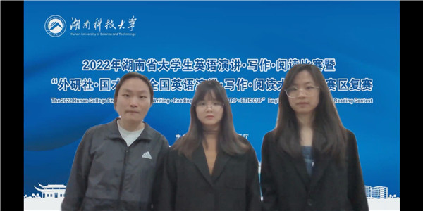 11月18日至20日,2022年湖南省大学生英语演讲?写作?阅读比赛暨“外研社?国才杯”全国英语演讲?写作?阅读大赛湖南赛区复赛以线上方式进行。本次大赛由湖南省教育厅主办,湖南科技大学承办。大赛吸引了全省52所本科院校代表同台竞技。最终,我校派出的三组选手凭借在英语演讲、英语阅读和英语写作三项比赛中的稳定发挥,成功斩获团体二等奖,以及一等奖2项,二等奖4项和三等奖3项。