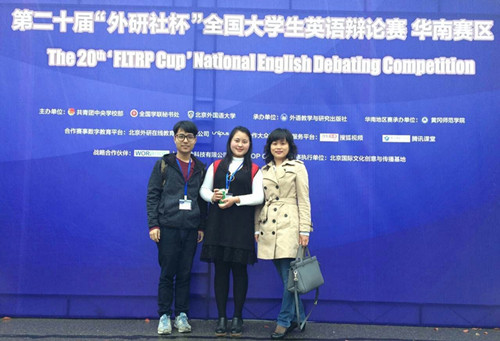我校派出由2014级外语学院孙鑫和交通学院熊威组成的代表队参加了比赛,外语学院王浩萍老师担任指导老师兼领队。经过五场循环赛的激烈角逐,我校选手凭借缜密的逻辑思维与流利的英语表达,最终获得华南赛区三等奖。桂林电子科技大学代表队摘得桂冠,国防科学技术大学代表队获得亚军,黄冈师范学院代表队与香港中文大学(深圳)代表队分别获得季军。