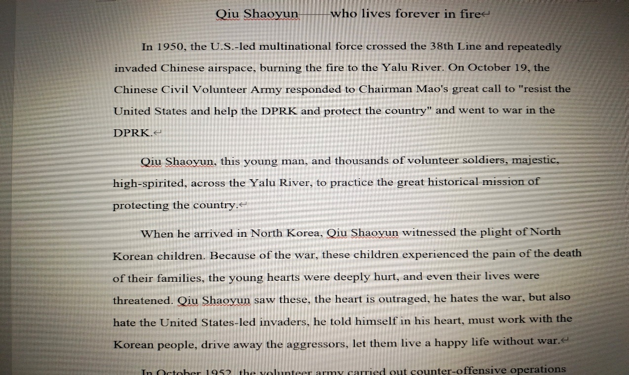 2021年8月6日,来自太阳成集团tyc122cc入口外国语学院党史学习实践团的邱月琴在家中对邱少云的英雄事迹进行了汉译英的翻译。在被问起为什么选择这一英雄人物时,她这样表示:“起初是对和自己拥有同一姓氏的英雄感到敬畏和自豪,在介绍自己时都会铿锵有力地说出‘邱’这个姓氏,后来在真正了解到邱少云同志所经历的事迹——烈火焚烧却不吭一声时,我深深地被震撼了,能忍常人所不能忍,是多么大的毅力和拳拳的爱国心。”