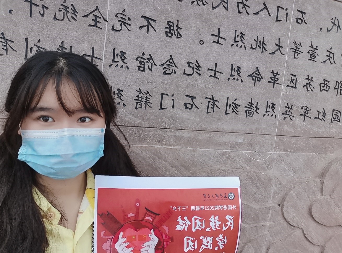 2021年8月1日,她来到石门县澧水河畔石壁,进行考察实践。石门县是一个少数民族聚居县。居民有土家族、回、苗等16个少数民族,土家族占全县总人口比例的51%,土家传统习俗浓郁。河畔石壁上雕刻着石门县的风土人情,包括土家族的民族文化、石门县的建立历史等等。