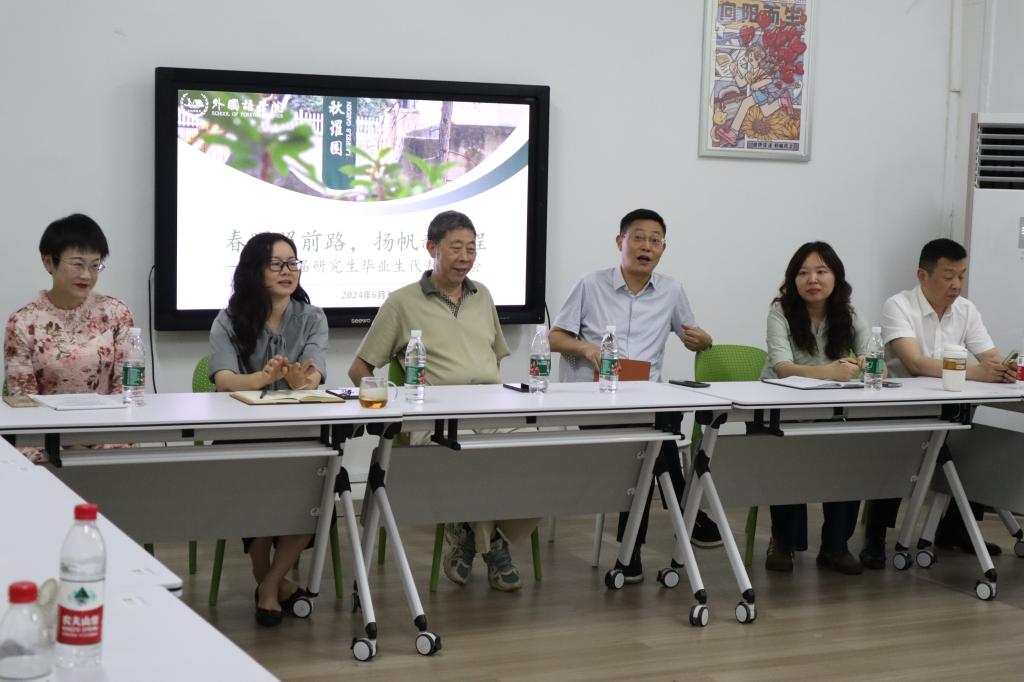 2024年6月3日下午15:00,外国语学院于金盆岭校区三教220召开了2024届研究生毕业生座谈会。会议由副院长姚尧主持,督导陈建生教授、院长段胜峰、院党委书记文丽丽、副院长黄坚等领导,周雪婷、付臻、张志武等导师代表,研究生辅导员龙洋和20位学生代表出席座谈会。