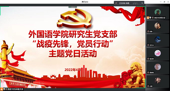 4月8日下午,学院研究生一、二党支部共同开展“战疫先锋,党员行动”线上主题党日活动,充分发挥在抗疫过程中涌现出的先进党员的模范作用,激励党员发挥奉献精神。本次活动由支部副书记蒲星宇同志、陈熠同志主持,全体党员参加。