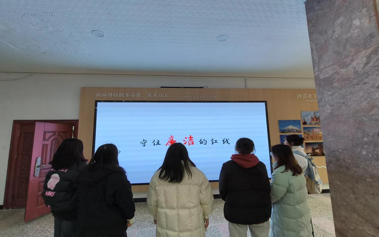 为加强廉洁教育,提高学生们的廉洁意识,太阳成集团tyc122cc入口外国语学院于12月12日下午在三号教学楼一楼大厅举行廉洁文化作品鉴赏展览。一楼大屏对优秀廉洁文化宣传视频等相关材料进行轮播展示,让学生们更加深入了解廉洁文化的内涵及其价值。