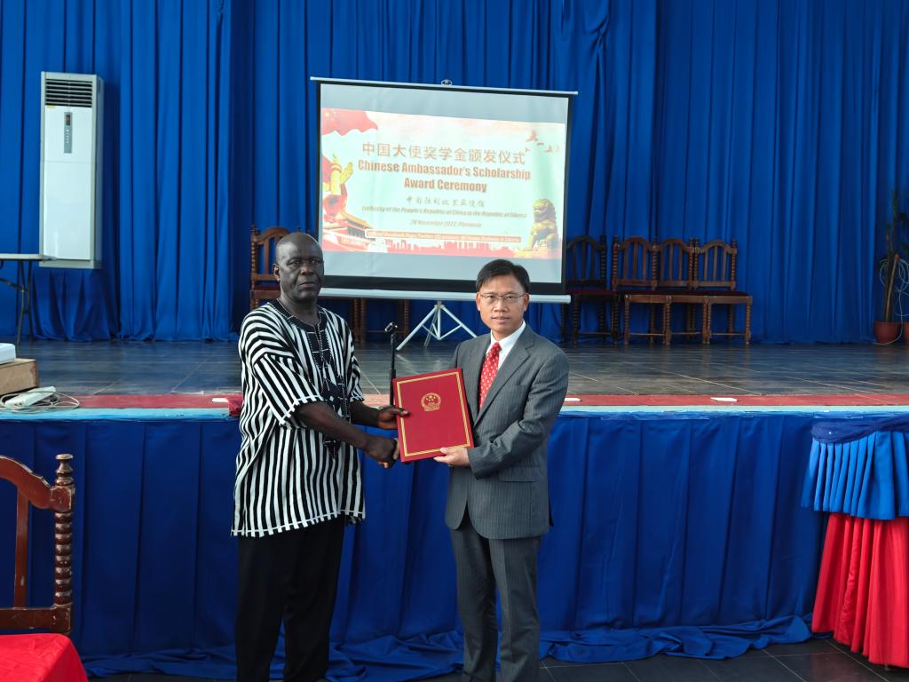 当地时间2023年11月28日,中国驻利使馆在利比里亚大学国会山校区大礼堂为131名利比里亚的大学生颁发了2023年“中国大使奖学金”,其中利比里亚大学孔子学院有12名学生获此奖项。中国驻利大使尹承武及随行人员、获得奖项的各高校校长或副校长、大使奖学金获得者、利大孔院全体教职员工及部分学生、利大学生代表等百余人参加颁奖仪式。
