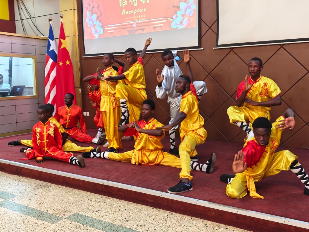 随后,孔院本土老师和学生为来宾们呈现了精彩的表演。他们演唱了富有利比里亚特色的歌曲Mama Liberia,展现了师生们深深的爱国情怀,用音乐传递了两国间的文化,促进了中利两国间的理解和友谊。更令人惊叹的是,孔子学院武术课堂的学生们在招待会上展示了中国武术的魅力,他们精湛的技艺赢得了现场观众的阵阵掌声。