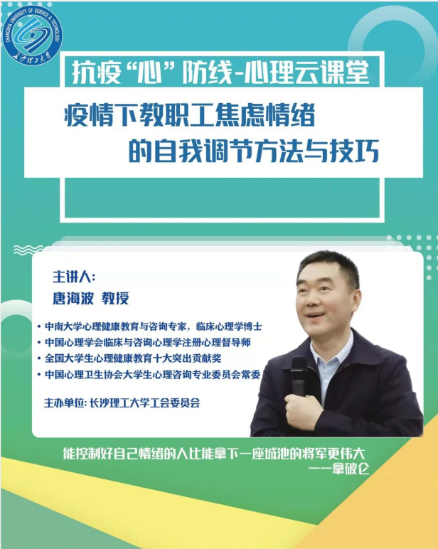 抗疫“心”防线,心理云课堂 。4月5日校工会特邀中南大学心理健康教育与心理咨询专家唐海波教授作《疫情下教职工焦虑情绪的自我调适方法与技巧》线上心理讲座,为教职工送上实用的“心理防疫宝典”。同时为教职工提供高校疫情心理咨询热线,关注全校教职工的“心理防疫”需求,全方位保障大家的身心健康。