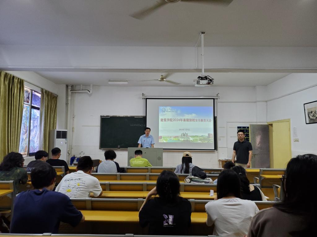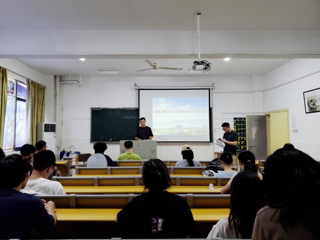 7月9日,建筑学院在16教313召开2024年建筑学院暑期留校学生安全教育大会。党委副书记李家春、研究生辅导员王宇霖、本科生辅导员郭恒及申请暑假留校的23名本科生、23名研究生到场参加,会议由本科生辅导员郭恒主持。