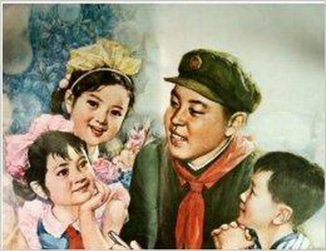 一个阳光灿烂的中午,雷锋穿着崭新的军装,胸前飘着鲜艳的红领巾向建设路小学走去。红领巾在阳光下闪闪发亮,把他的脸映得红