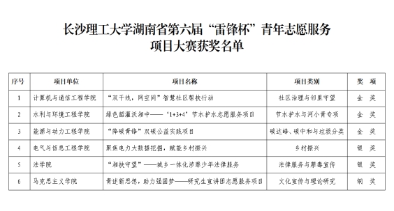 我校共6个项目团队入围终审决赛,最终获得“三金两银一铜”的好成绩。其中,计通学院“双干线 网空间”智慧社区帮扶行动、水利学院绿色韶灌沃湘中——‘1+3+4’节水护水志愿服务项目和能动学院“降碳青锋”双碳公益实践项目荣获金奖,电气学院“聚焦电力大数据挖掘,赋能乡村振兴”项目和法学院“湘扶守望”——城乡一体化涉罪少年法律服务项目荣获银奖,马克思主义学院青述新思想,助力强国梦—研究生宣讲团志愿服务项目荣获铜奖。