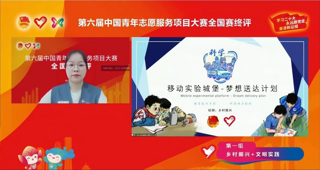 11月12日至13日,由共青团中央、中央文明办、民政部、水利部、文化和旅游部、国家卫生健康委员会、中国残疾人联合会联合主办的第六届中国青年志愿服务项目大赛暨2022年志愿服务交流会在山东济南举行,来自全国各地的500个志愿服务项目入围国赛终评,分六个组别同时展开线上路演答辩。最终我校物电学院移动实验城堡——梦想送达计划项目获评乡村振兴组别全国银奖;文新学院湘楚拾遗志愿服务项目获评文化传播与旅游服务组别全国铜奖。