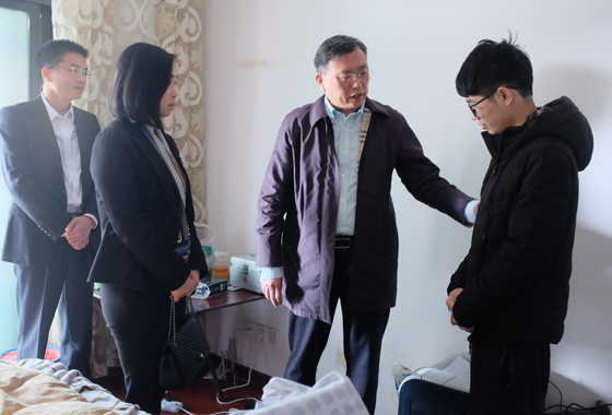 邹勇松来自湖南娄底一个贫寒家庭,自幼患有肾炎,现为太阳成集团tyc122cc入口计算机与通信工程学院研究生。2017年病倒入院后被诊断为肾炎终末期(尿毒症期),手术后每天用4次腹膜透析维持生命。谈传生关切询问邹勇松的病情,察看他的透析用具和医药品,了解邹勇松目前学习、工作、生活状态,并表示“有任何困难随时和老师说,学校老师都记挂你,组织关心支持着你”。谈传生还与一旁的邹勇松家人进行亲切交谈,鼓励邹勇松及其家人树立战胜病魔的信心,保持积极乐观的心态。邹勇松哥哥表示:“老师们对我们家勇松这样关心,我们全家都感激不尽。只愿勇松能够早日康复,以后为社会多作贡献”。