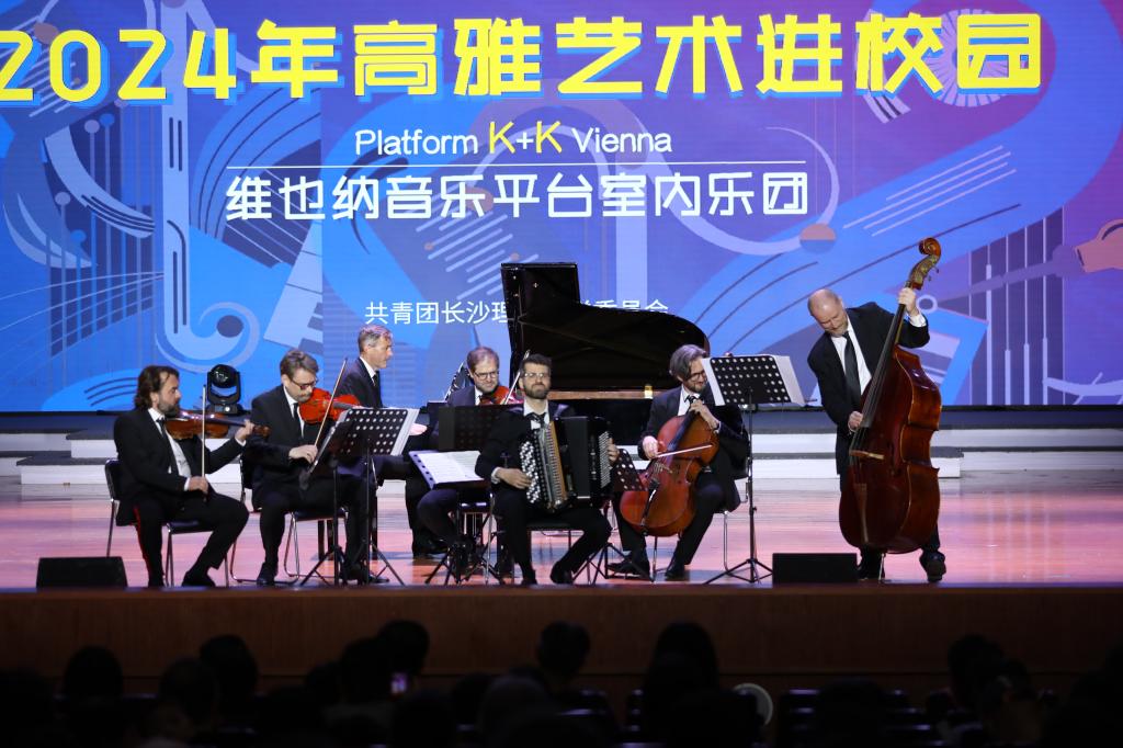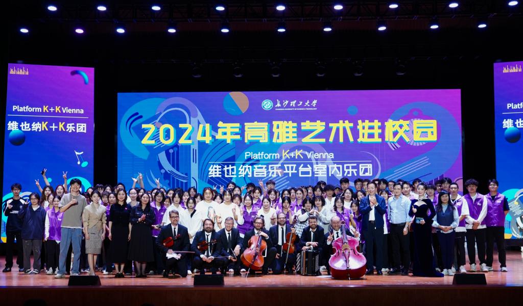4月23日,高雅艺术进校园维也纳音乐平台室内乐团(Platform K+K Vienna)音乐会在我校云塘校区大会堂成功举行。校党委书记付宏渊与全校师生一千六百余名师生共同欣赏此次音乐会。