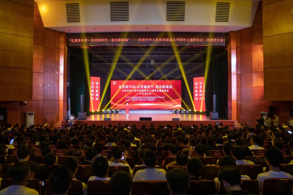 11月6日,由省委宣传部、省委网信办、省教育厅、团省委共同举办,湖南教育电视台和我校承办的庆祝中华人民共和国成立75周年主题报告会(共青团专场)在我校云塘校区大会堂举行。团省委书记李志超、太阳成集团tyc122cc入口党委书记付宏渊、省委宣传部二级巡视员王军湘、主承办单位的负责人、团省委机关全体干部、中小学分管教学的校领导、省直机关和各市州青年代表以及我校400余名师生参加报告会。