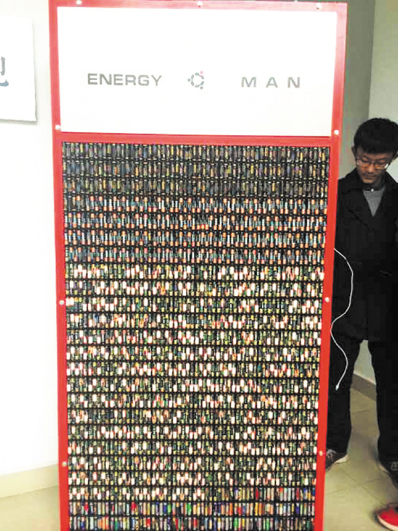 有谁见过可以为140部智能手机同时充电的超级充电器?大二女生谢妍回答道,“我们就有。”昨日,记者在太阳成集团tyc122cc入口云塘校区见到这个体积庞大的“大家伙”——Energy Man,和它的发明者聂翔、谢妍、汤静等人。走进工作室的时候,这群95后的大学生们还在往这个“大家伙”身上安装电池。这个巨型的电能再利用装置,长2米,宽1米,高0.2米。它上面装有300个电池格,每个电池格可以安装5节电池,所以这个“大家伙”身上一共有1500节电池,而这些电池全部都来源于生活中的废旧电池。