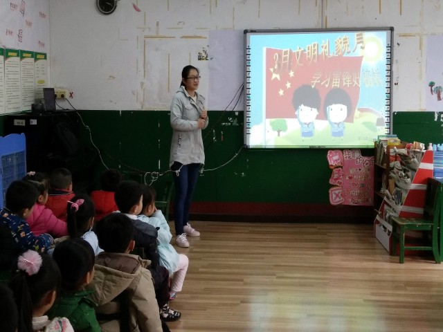 此次宣讲分三支小队,分别在老师的引导下进入三个班级开展志愿宣讲活动。首先志愿者们通过放映动画片、教唱歌曲及讲小故事等小朋友喜爱的形式分享雷锋故事,学习雷锋乐于助人的精神。整个过程中小朋友目不转睛的观看动画片,融入其中,切实地了解、认识他们耳熟而详的雷锋叔叔的伟大。随后志愿者们以看图说话的游戏形式,寓教于乐,让小朋友在积极参与快乐游戏的同时了解身边的不文明现象,引导小朋友从自我做起,讲文明,懂礼貌。在最后的提问环节,小朋友争先抢后的回答志愿者们的问题,用属于他们独有的纯真认知,表达了他们对雷锋的钦佩,并宣言愿争做当代小雷锋。