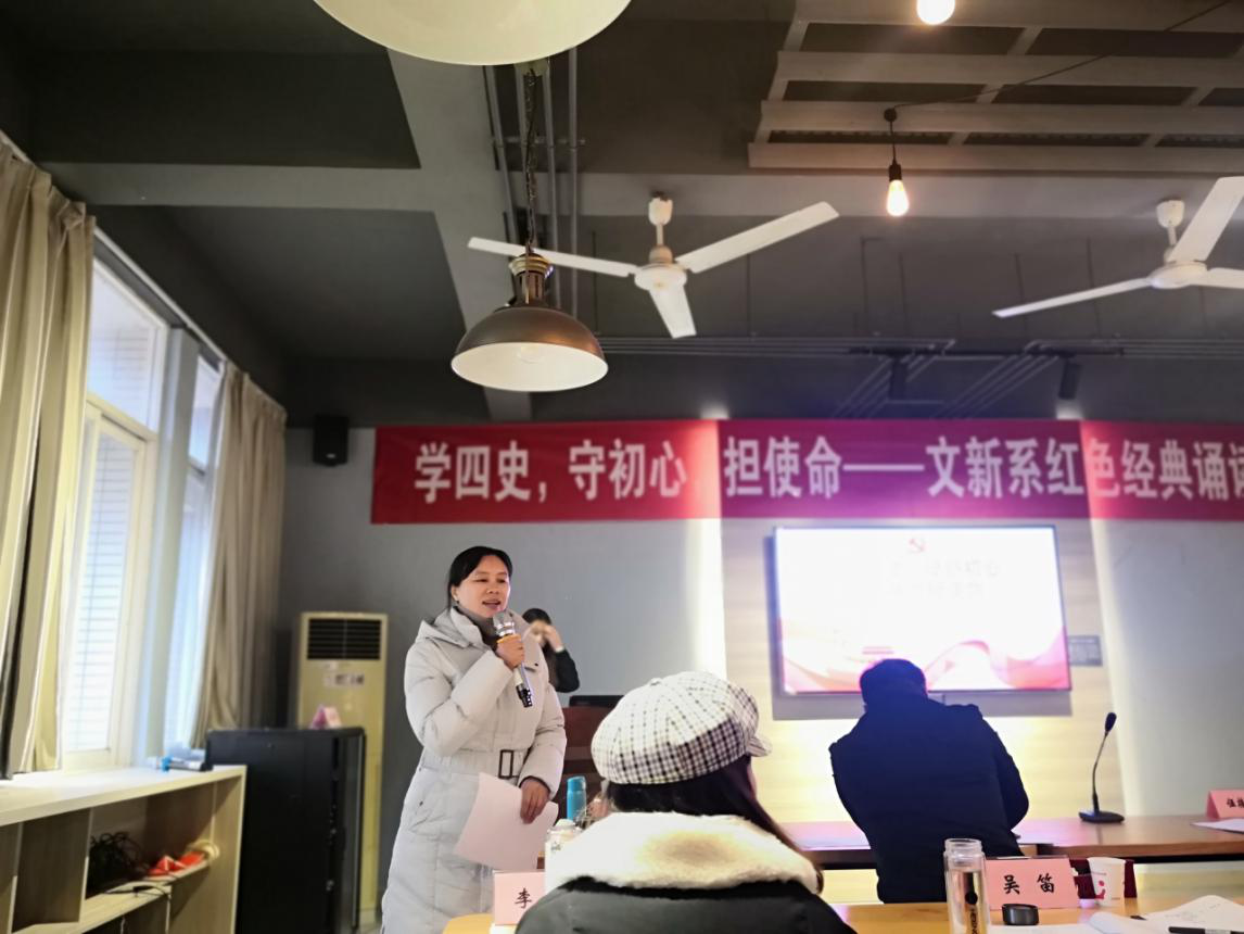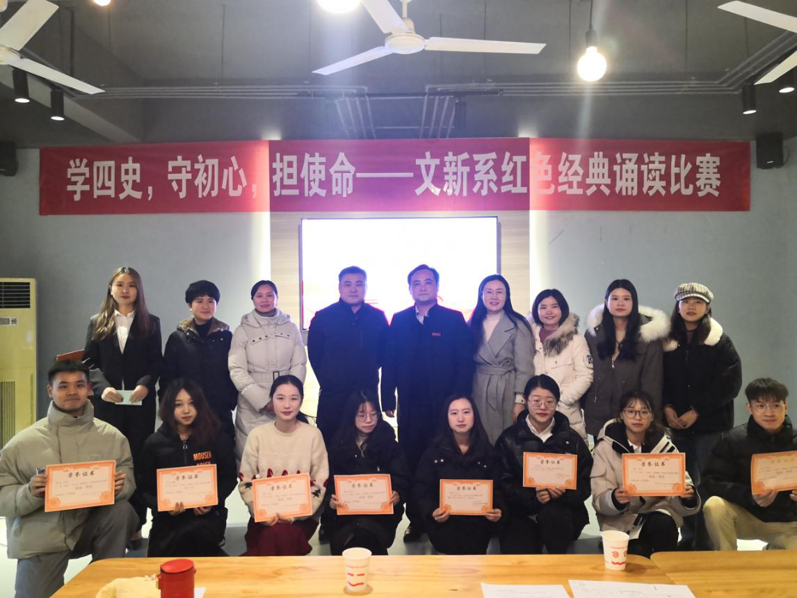 1月7日下午,文学与新闻学系“读四史、守初心、担使命”红色经典诵读比赛决赛在云塘校区文科楼B501教室举行。文新系党总支书记伍接朝、校党委组织部组织科科长乔法光、文新系行政党支部书记汤路、新闻教工党支部曾志华老师以及全体辅导员出席此次活动。