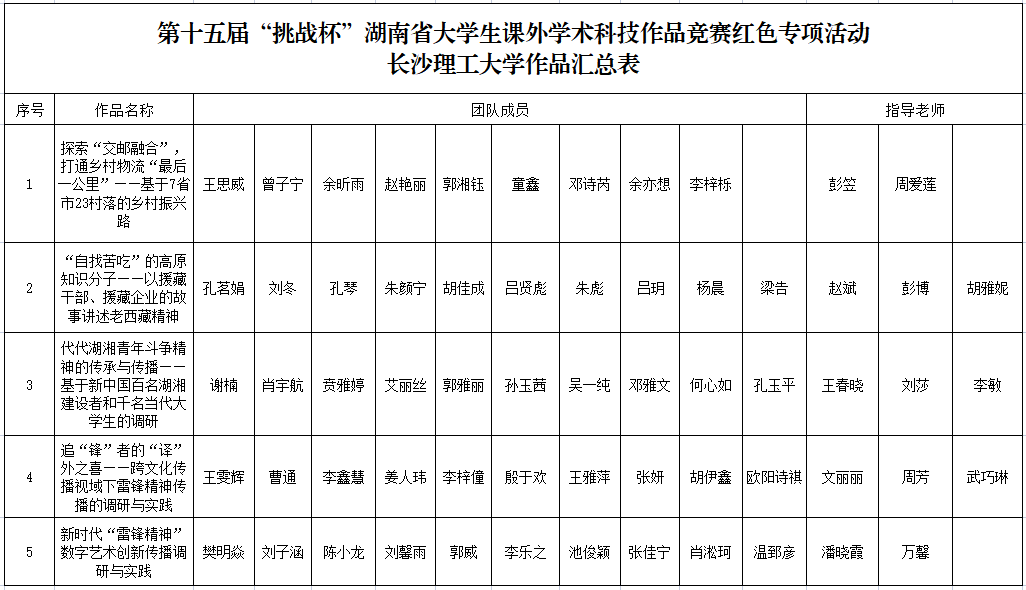经专家评审,我校拟推荐5项作品参加第十五届“挑战杯”湖南省大学生课外学术科技作品竞赛红色专项活动。