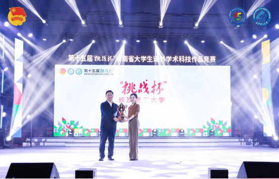在颁奖环节,我校荣获大赛最高荣誉“挑战杯”,中南大学等20所高校捧得“优胜杯”,湖南大学等25所高校荣获优秀组织奖。16件作品荣获特等奖、41件作品荣获一等奖、124件作品荣获二等奖。其中,63件作品将代表我省参加今年“挑战杯”国赛。