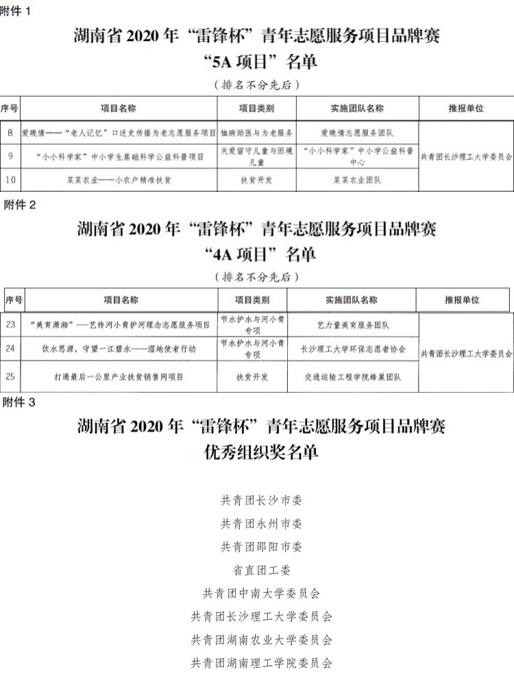 近日,由共青团湖南省委、湖南省青年志愿者协会等部门共同主办的湖南省2020年“雷锋杯”青年志愿服务项目品牌赛决赛落下帷幕。经项目申报、组织推报、资格审查、网络评审、项目公示、实地调研、集中授课、决赛路演答辩和专家评审多个环节,我校物电学院《“小小科学家”中小学生基础科学公益科普项目》、艺术学院《爱晚情—“老人记忆”口述史传播为老志愿服务项目》及《菜菜农业—小农户精准扶贫》3个项目被授予 “5A项目”称号,交通学院《打通最后一公里产业扶贫销售网》、艺术学院《“美育潇湘”——艺传河小青护河理念志愿服务项目》及化学学院《饮水思源,守望一江碧水——湿地使者行动》3个项目被授予“4A项目”称号,我校获评优秀组织奖。