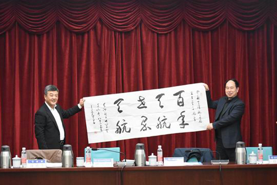 总结汇报及交流座谈会的召开恰逢中交天津航道局有限公司120年华诞,会议正式开始前,黄立宏代表学校,水利学院常务副院长胡旭跃代表学院向中交天津航道局有限公司赠送了“百年天航  世界天航”书法礼品和湘绣礼品。