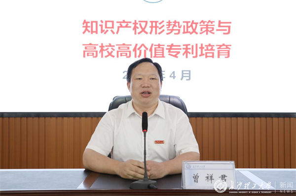 曾祥君致欢迎词。他对康勇副局长一行表示欢迎,并对长沙市知识产权局对学校的支持表示感谢。他结合自己做科研的经历谈到知识产权及专利的重要性,勉励大家做真科研,出好专利、高价值专利,并做好专利的保护与运用。他指出我校知识产权申请认定工作职责调整至科技成果转移转化中心(知识产权中心),目的就是从知识产权的创造、保护和运用等方面实现全流程管理,并希望通过此次培训提升全校科研人员知识产权创新、保护及转化意识,推动我校知识产权工作高质量发展。