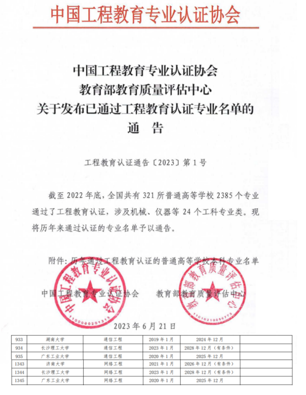 近日,中国工程教育专业认证协会公布了2022年通过工程教育专业认证的专业认证结论,全国高校共有441个专业通过了工程教育认证。我校通信工程、网络工程等2个专业位列其中,认证有效期6年(2023年1月至2028年12月)。
